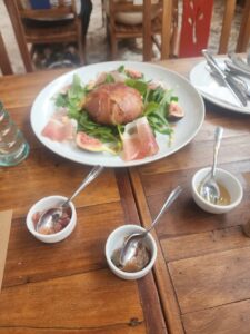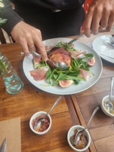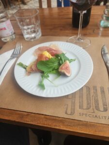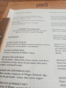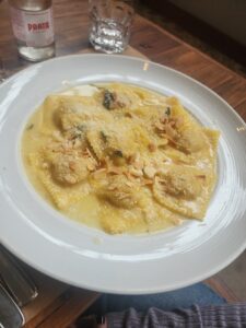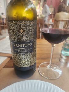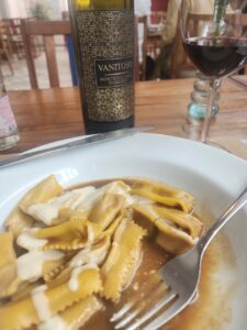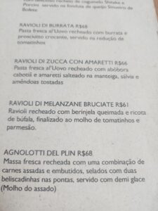 Tivemos de entrada pãezinhos artesanais, grissini, uma maravilhosa entrada com o queijo Benzinho de Bofete envolto em Speck uma forma de presunto crudo italiano ao forno, com folhas de rúcula, geleias, mel, presunto crudo e laminas de amêndoas. Escolhemos um Ravioli de Zuca con Amaretti, recheado com abóbora cabotiã e amaretti, salteado na manteiga, sálvia e lascas de amêndoas tostada e o Agnolotti del Plin recheado com carnes assadas e embutidos com o molho doas assados em Demi Glace. Todos os 3 pratos divinos. Para acompanhar fomos de vinho italiano Vanitoso um bom Montepulciano D’Abruzzo do produtor Nobile delle Rocche. Mais uma vez tudo maravilhoso, um vinho bem interessante para acompanhar a comida super saborosa.