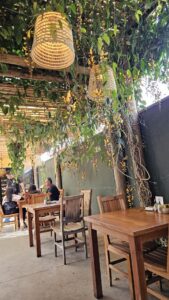 O local é bem arborizada com muitas plantas, flores incríveis que embelezam o lugar. Tem um espaço para crianças brincarem, uma loja com os produtos orgânicos, padaria, sorvetes e o restaurante. Bem amplo com uma área interna com a loja ao fundo, uma parte é aberta com exposição de tortas, salgados e outra semiaberta com cobertura na entrada. A decoração é rústica, com muitas plantas no teto que refrescam o caminha, móveis de madeira, tudo bem tranquilo, claro e alegre. Os funcionários são bem prestativos, comunicativos e sorridentes, informando sobre as diferentes opções de pratos quentes, frios, lanches, sucos, cafés, vinhos orgânicos, doces e sorvetes.