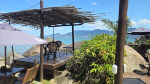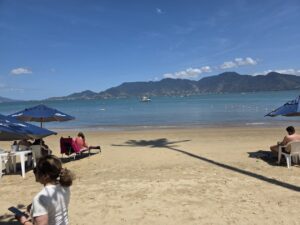 Ficamos na praia tomamos água de coco, água e ficamos no guarda sol, sentado nas cadeiras, mas o atendimento foi meio desorganizado e um pouco agressivo e persistente, chegamos a ver o cardápio com bons pratos de frutos do mar e uma boa carta de vinhos, mas pela insistência em ter que reservar o nosso grupo de mais de 15 pessoas desistiu e fomos almoçar na cidade.