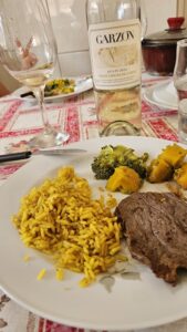 Vinho de cor amarelo palha bem intenso, com reflexos dourados, bem brilhantes, finas e lentas lágrimas. Aroma bem intenso com um belo ataque inicial cítrico de toranja, limonada, Limão Galego, laranjada, seguido de maçã verde, maracujá, abacaxi, pedra molhada, sal, giz, com persistência média. Na boca um vinho bem agradável, com bela acidez, bem refrescante, pedindo frutos do mar e uma piscina. Com corpo médio, com álcool bem integrado, final ligeiramente salgado, mineral, mas bem frutado, com limonada, laranjada, abacaxi, maracujá, maçã verde, bem persistente. Acompanhou muito bem a salada de rúcula, pepino, tomate cereja e depois o filé mal passado acompanhado de brócolis, abóbora e o arroz com açafrão que a Cissa fez no almoço na casa dela… Gostei, bela relação custo x benefício. A presença da Cissa melhorou muito este belo vinho.