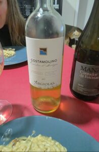 Vinho de cor amarelo ouro pálido, com reflexos dourados, bem brilhantes, finas e lentas lágrimas. Aroma de média intensidade de damasco seco, maçã verde, peras, seguido de uma base cítrica de limonada, Limão Galego, laranja Lima, Lima da Pérsia, abacaxi, manga, maracujá, menta hortelã e um final mineral de pedra molhada, giz, com boa riqueza de detalhes, mas persistência média. Na boca um vinho bem agradável, seco, com bela acidez, refrescante, corpo médio, álcool bem integrado. Um intrigante final ligeiramente salgado, mineral, mas frutado, com limonada, laranjada, Lima da Pérsia, abacaxi, maracujá, maçã verde, com persistência média. Acompanhou muito bem o risoto de queijo Parmesão, Figo Seco, Cogumelos Portobello, lâminas de Alho e cebola caramelizada que preparei no jantar para a linda Cissa. A presença dela melhorou muito este belo vinho. Ele se saiu melhor que o bom Manz Contador de Histórias.