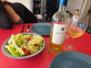 Vinho de cor amarelo ouro pálido, com reflexos dourados, bem brilhantes, finas e lentas lágrimas. Aroma de média intensidade de damasco seco, maçã verde, lichia, limonada, laranjada, doce de laranja azeda, Lima da Pérsia, abacaxi, maracujá, hortelã e um final mineral de pedra molhada, giz de cera, com boa riqueza de detalhes, mas persistência média. Na boca um vinho bem agradável, seco, com bela acidez, refrescante, corpo médio, álcool bem integrado. Ficou ainda melhor no dia seguinte, talvez pela aeração o final ligeiramente salgado, mineral ficou ainda mais gostoso. Continua com um final frutado, com limonada, laranjada, Lima da Pérsia, abacaxi, maracujá, maçã verde, hortelã, desta vez mais persistente. Acompanhou muito bem a salada de alface, tomate cereja, burrata de bufala e o risoto de queijo Parmesão, Figo Seco, Cogumelos Portobello, lâminas de Alho e cebola caramelizada que preparei no jantar para a linda Cissa, agora no almoço ainda melhor. Também combinou com o penne com molho branco, frango desfiado e salsinha que o Du fez para os amigos. A presença dela melhorou muito este belo vinho.