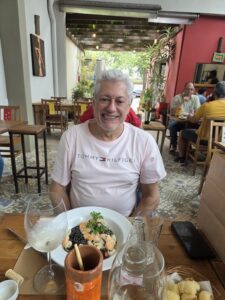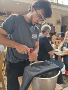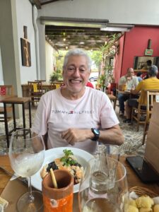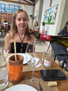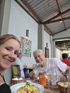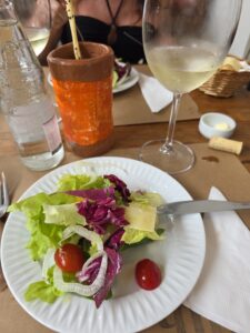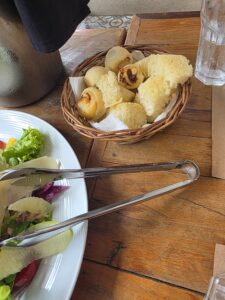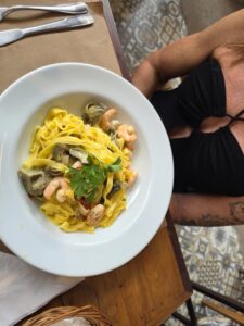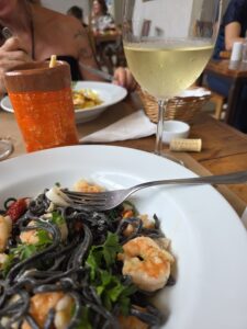 Tivemos de entrada pãezinhos artesanais com manteiga aromatizada, grissini, uma maravilhosa salada com mix de folhas, maça verde, frutas cítricas, erva doce, tomate cereja, lascas de parmesão, azeite extra virgem e pães artesanais. Escolhemos um Linguini em tinta de Lula com camarões, lulas, mexilhão, posta de robalo – com frutos do mar e um Papardele de camarão e alcachofra. Dois pratos divinos, muito saborosos e bem servidos. Para acompanhar fomos de vinho da serra de Botucatu da vinícola Refúgio, um Chardonnay Léguas em homenagem a Júlio Verne. Mais uma vez tudo maravilhoso, um vinho bem marcante para acompanhar duas massas super saborosas.